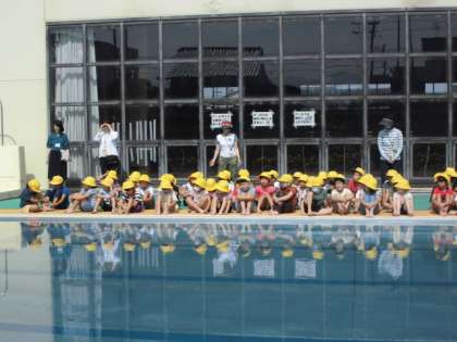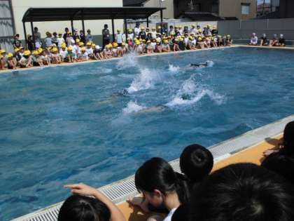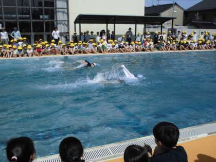 5、6年生の模範水泳や代表児童の挨拶がありました。きれいな泳ぎに大きな拍手が送られました。
