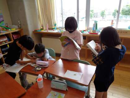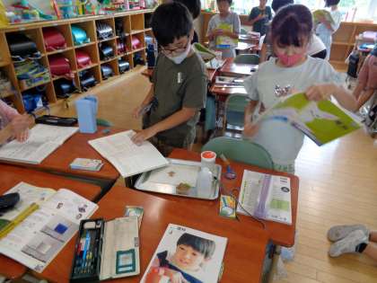 砂や土のつぶの大きさによって水のしみ込み方にちがいがあるのか調べました。実際に水をしみこませてみると、時間がかかるものもあることから砂のつぶとしみ込み方には関係があることに気付き、さらに調べていこうとしています。