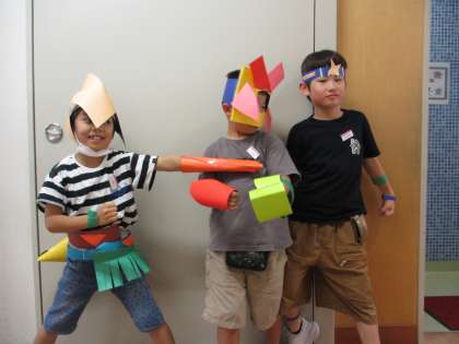 「わっかでへんしん」の学習では、紙で作った様々な輪を体に付けて、着飾りました。子供たちは、動物や兵士等、変身したいものを考えながら輪の形にも工夫を凝らしていました。