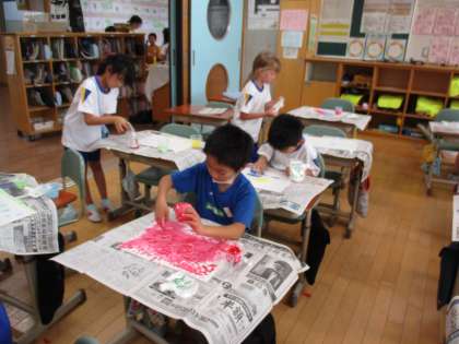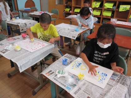 液体粘土に絵の具を混ぜて、手を使って絵を描きました。手指で紙面に「とろとろ絵の具」を置き、偶然にできた形から絵を思い描きました。同じ色の絵の具でも、混ぜ具合で濃さに変化を持たせたり、指で置いた形から、桜や花火等を連想して絵を描き進めたりと、子供たちの思考や想像力にも成長を感じられる、すてきな作品が出来上がりました。