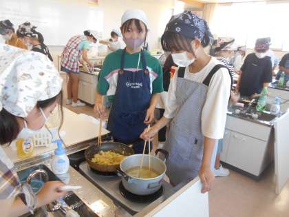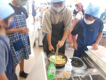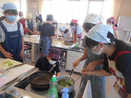 子供たちは、家庭科の学習の中でも特に調理実習を楽しみにしています。6年生で今学期は朝食のおかずとして、野菜の彩り炒めに挑戦しました。野菜によって異なる加熱時間や順番を考えて調理していました。