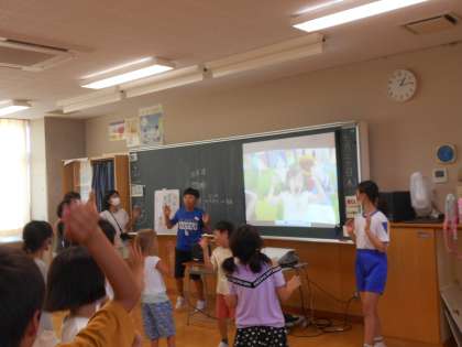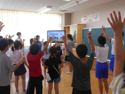 子供たちは、たてわり清掃やふれ合いタイムなど、たてわり班活動にも積極的に取り組んでいます。今回は久しぶりのふれ合いタイムで、夏休みにも体を動かせるように、体操や楽しいダンスをみんなで行いました。最初は恥ずかしがっていた6年生も、下級生の子供たちと踊っているうちに、楽しそうにしていました。