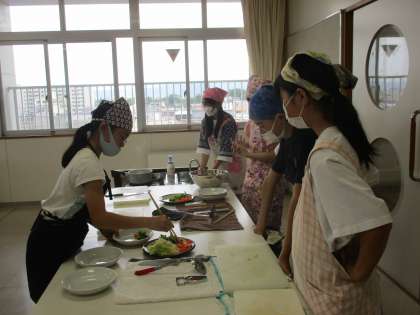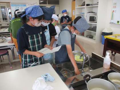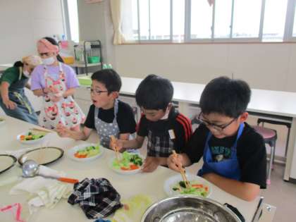 家庭科の学習で、ゆで野菜サラダをつくりました。野菜の種類に合わせて切り方やゆで時間を調整し、満足のいくサラダをつくることができました。