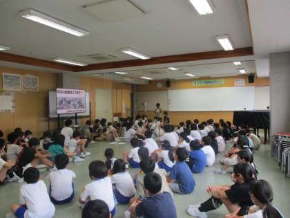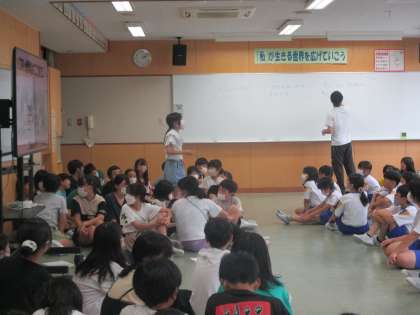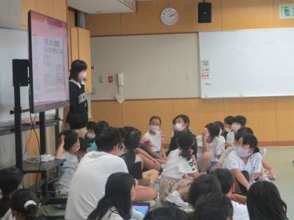 総合の授業では、今までやってきたSDGsの取り組みを、4年生にむけて発表しました。5年生はこの日のために、何度も発表練習をがんばってきました。4年生からの質問にも、ハキハキと答える5年生のたくましい姿がたくさん見られました。