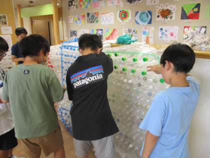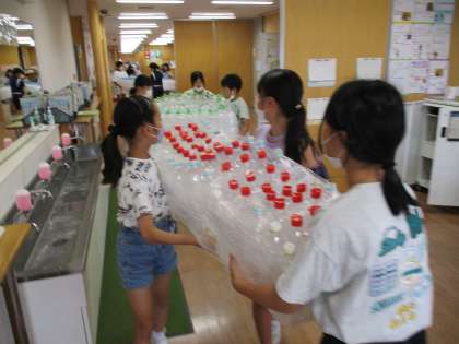 150周年記念式典に向けて、5年生では去年みんなで作った「150」の数字をモチーフにしたオブジェを体育館に設置しました。このオブジェ、実はペットボトルから作られたものです!みんなの思いや努力がつまったペットボトルは、とっても輝いていました!