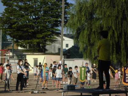 左:7月25日「ラジオ体操始まり式」(西田地方校下児童クラブ・PTA主催)