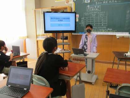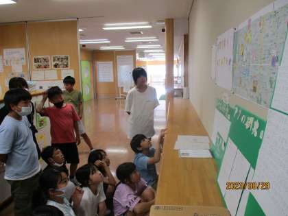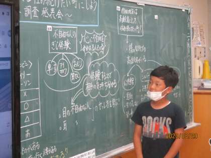総合的な学習の時間では、夏休みに「だれにとっても住み続けたい町」をテーマに、子供たちが自分で課題を決め、調べ学習を行いました。子供たちは、調べて検証してきたことを堂々と発表することができました。