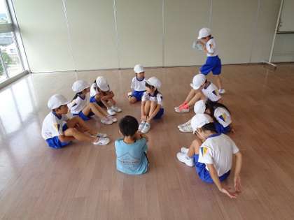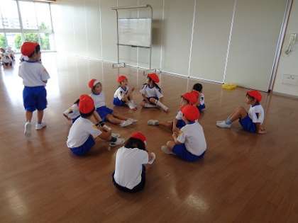 ハンカチおとしをしました。ルールの分からない友達に説明する様子が見られ、色団のみんなで仲よく活動しました。