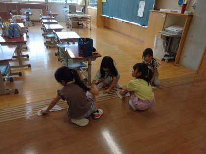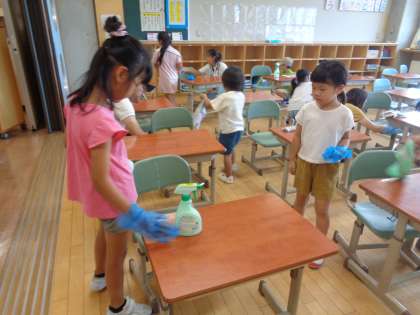保護者の方は、普段の清掃ではできない窓拭きや高い棚、子供たちは、床や椅子をぴかぴかにしてくれました。