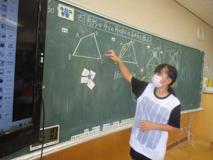 四角形の4つの角の大きさの和を考える5年生の子供たち。図を切ったり、友達と相談したりしながら、角度をはからずに求める方法をいくつも見付けていました。