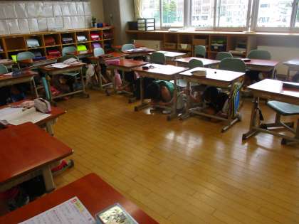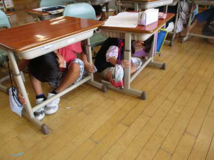 今日は、シェイクアウとやまに参加し、地震の時の身を守る動作の確認をしました。地震を想定した音が流れると、一斉に机の下に入り、両手で机の脚をもって、頭を守りました。自分で自分の身を守ろうと防災意識を高めました。