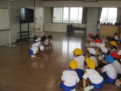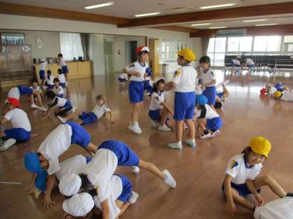 体育で、四季を体で表現する学習をしました。今日は冬を表現しました。子供たちからは冬から連想できる言葉として、クリスマスやみかん、お正月等が出ました。その後、出てきた言葉を即興で表現しました。テーマが「みかん」のときは、皮がむける様子を座った状態からごろんと転がって表現するなど、全身をつかって楽しんで取り組んでいました。この学習で出た表現をダンスに生かし、学習発表会で披露できたらと思います。