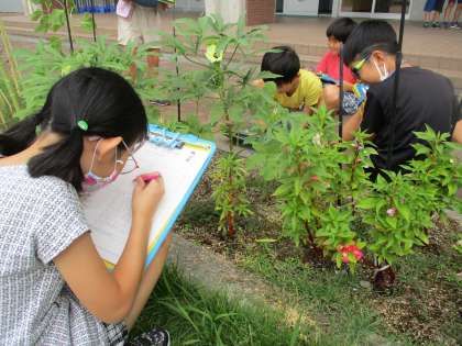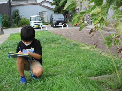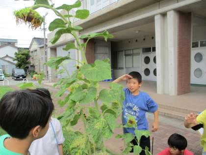 理科の学習で、春に植えた種から育っている実の様子を観察しました。「ぼくの背より大きくなっているよ」「一つの種から育っているのに、たくさんの種かできているね」など、観察カードに記録をしました。