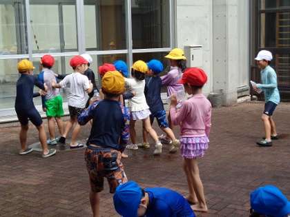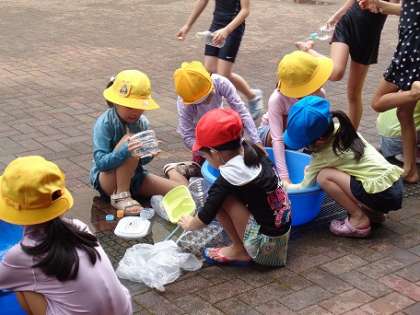 9月になっても暑い日が続いています。ペットボトルでシャワーを作ったり、的当てをしたりして、水の気持ちのよい感触を楽しみました。