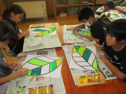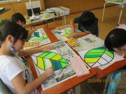 3年生の学習発表会の小道具作り。今回は、1人1人がもつ葉っぱを作りました。緑や黄緑、黄色と、自分の好きな色を組み合わせてクレヨンやポスターカラーを使い、オリジナルの葉っぱのできあがりです。劇ではどんな様子になるのかお楽しみに。