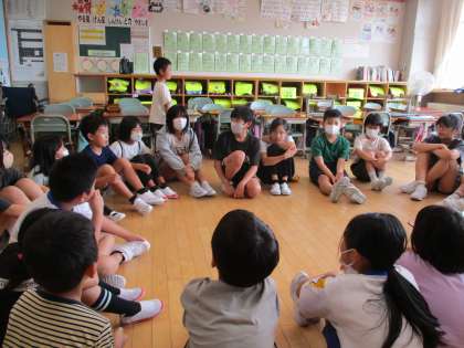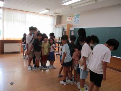 9月20日にたてわりふれあいタイムがありました。子供たちは、ファミリー班で遊ぶことをとても楽しみにしています。各ファミリー教室では、絵しりとりや新聞ゲーム、ハンカチ落とし等、様々なゲームが行われていました。教室に戻ってきた2年生は、笑顔いっぱいでした。