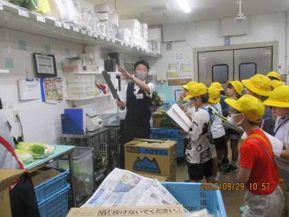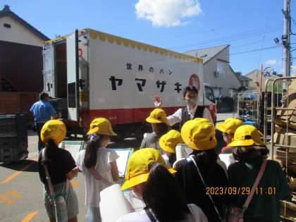 バックヤードでは、とても大きな包丁で野菜を小分けにしていました。子供たちは、その大きさにびっくりしていました。牛乳が保管してある冷蔵庫にも入らせてもらいました。とても貴重な時間でした。裏口には、ちょうどタイミングよくパン屋さんのトラックが到着していました。お客さんの車の邪魔にならないように裏から運ぶことを知りました。