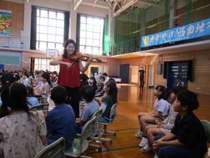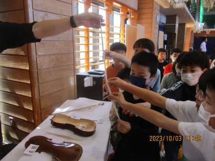 学校コンサートで、ヴァイオリンとピアノの演奏を間近できくことができました。ヴァイオリニストが座席のすぐ近くまで来て演奏してくださいました。曲に合わせて体を動かして楽しんだり、楽器について知ることできたりして、生演奏の魅力に引き込まれた3年生でした。