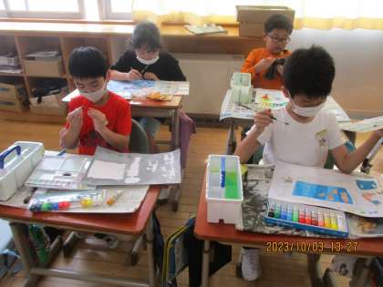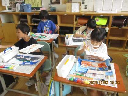 図画工作科では、絵に表そう「あの日あの時の気持ち」の学習の様子です。楽しかったことや心に残ったことなどその時に感じた気持ちを表しました。表情や動きの工夫を意識して、楽しく仕上げました。