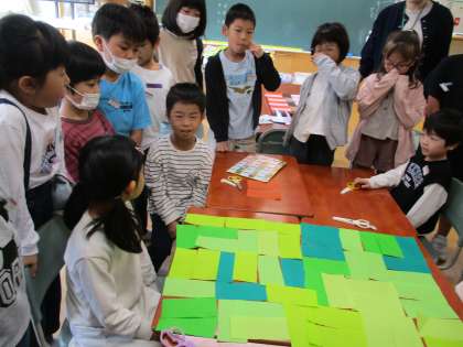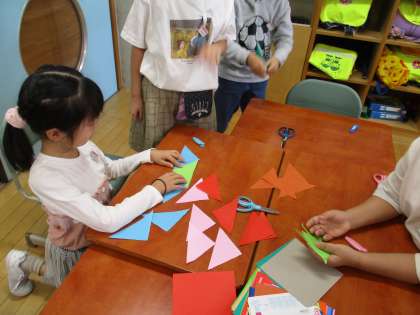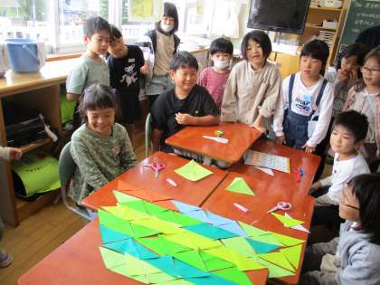 今日は、昨日までに学習した長方形と直角三角形を並べて模様をつくりました。折り紙を折ってハサミで切ると、正方形の折り紙が長方形や直角三角形になることに気付き、グループで形を切って隙間なく並べました。長方形や直角三角形は辺が全て直線でないといけないことから、子供たちはまっすぐ切ることに難しさを感じていました。色づかいもグループの友達と考え、山や海等きれいな模様ができました。