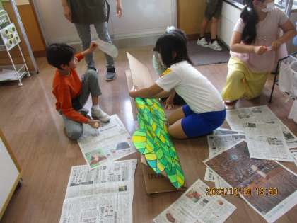 発表会に使う小道具作りをしました。今回は、ふもとに置く葉っぱ作りです。長い大きな段ボールにいくつもの葉っぱを貼りました。「この葉っぱを立たせるには、どうしたらいいだろう」「後ろで支える段ボールを貼ったら、立つんじゃないかな」子供たちは、自分たちで考えながら協力して作っていました。