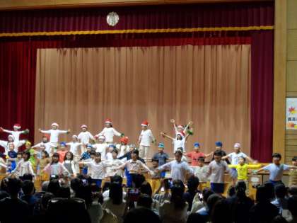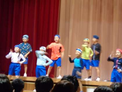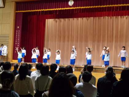 体育科の「表現遊び」「リズム遊び」、生活科の「サツマイモの収穫祭」、音楽科の「お祭りの音楽」と、3つの学習を組み合わせた発表。どれも子供たちが考えたり話し合ったりしたものを組み合わせた内容でした。自分たちの学びを生かしながら学習を進めていくことができるようになってきた姿に、大きな成長を感じます。