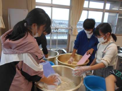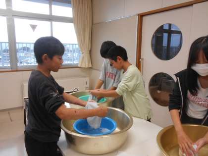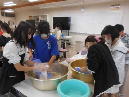 子供たちは、家庭科の学習で衣服の清潔な保ち方を学習しました。普段も家庭で洗濯は行っていますが、今回の実習では、掃除で使った雑巾を手洗いで洗濯しました。洗濯機を使えば簡単ですが、手洗いでは「手が疲れる」「雑巾だけでも時間がかかるよ」という声が聞こえてきました。しかし、雑巾を一生懸命洗ってきれいになると、達成感を感じていました。