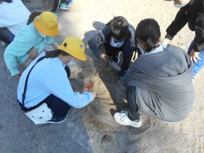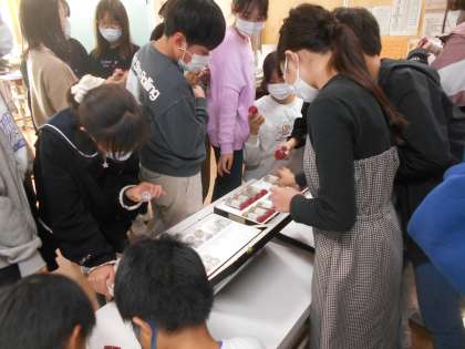 子供たちは、理科の学習で地層に含まれる成分を標本から調べたり、地層ができる過程を畑の土を使って実験し、観察したりしています。子供たちは、西田地方公民館が建てられる際に調査されたボーリング資料を観察しながら、「石の粒がそれぞれ違うね」「資料ごとの重さが違うかもしれない」と気付いたことをたくさん友達と話していました。身近な資料や材料から、地層についての理解を深めている子供たちでした。