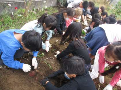 GW後に植えたサツマイモを掘りました。草むしりをしたり蔓返しをしたりしてお世話をしたサツマイモをいよいよ掘ろうと、子供たちはわくわくしながら畑に向かいました。4つの畝に植えたサツマイモは、いくつか枯れてしまっていましたが、大きく育っていました。土の深いところまで埋まっていて、一生懸命に土をかきわけたり折れないように優しく引っ張ったりして、収穫することができました。