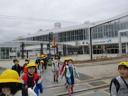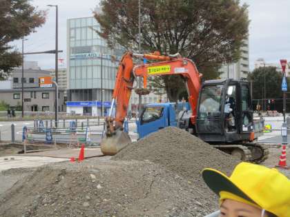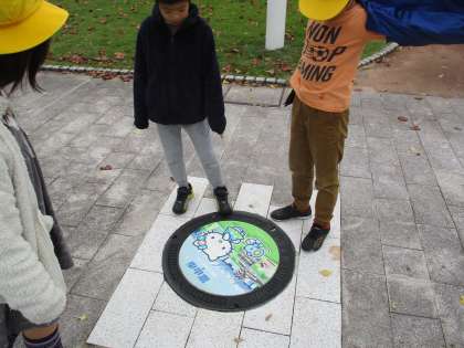 環水公園まで歩いて移動しました。途中の工事現場でショベルカーを見て、「こんなに近くで初めてみた」「すごいね」と驚いたり、公園では、マンホールの模様を見て、「かわいい」とつぶやいていました。
