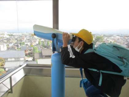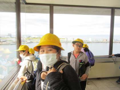 岩瀬カナル会館に到着後は、富山港展望台にのぼりました。たくさんの階段を登り、到着した展望台から見る景色はとても気持ちがよさそうでした。望遠鏡を使って、眺めた先に何が見えたのでしょうか。