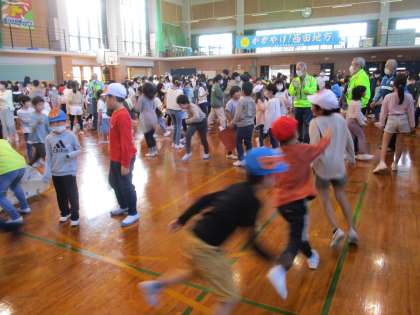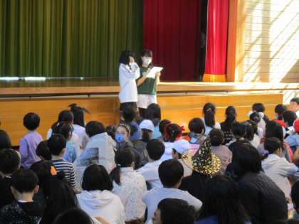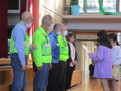 集会委員会で「ハロウィンでありがとうを伝えようカーニバル」をしました。ハロウィンということで、簡単な仮装をして参加する子供が多くいました。子供たちは家でゴミ袋や新聞紙でマントをつくってきたり、折り紙でつくったおばけを色団帽子に貼り付けたりして、仮装を楽しんでいました。集会には、特別ゲストとして登下校の安全を見守ってくださっている方たちをお招きし、普段から安全のために見守りをしてくださっていることに感謝を伝えたり、一緒にゲームを楽しんだりしました。