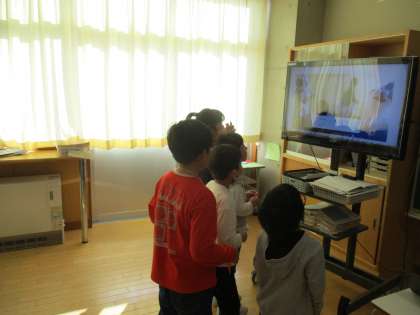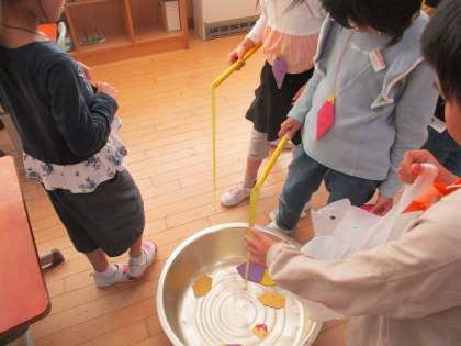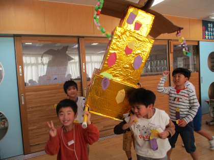 さつまいもが大きく育ち、たくさん収穫できたことをお祝いするために、さつまいもの収穫祭をしました。9月から子供たちが企画して準備を進めてきたもので、一人一つ記念の「サツマイモくん」を首からさげたり、折り紙でつくったさつまいもを釣るゲームをしたりしました。また、音楽の時間につくった「さつまいも収穫祭のための音楽」を演奏している映像を流すと、子供たちは映像に合わせて手拍子をしていました。さらに、みんなでつくった御神輿を担いでみたいという子供たちも多く、「わっしょい」と元気に声を出していました。