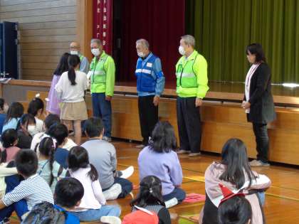 日頃お世話になっている防犯の見守り隊の方々にも参加していただき、児童集会を行いました。子供たちは、ゲームを通して見守り隊の方々と交流することができました。集会の最後には、児童代表が感謝の気持ちを伝えました。