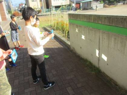 鏡を使って日かげに日光をはね返しました。「日かげの中に明るい形が見えたよ」「重ねるともっと明るくなったね」など、いろいろなところに日光をはね返しながら観察しました。