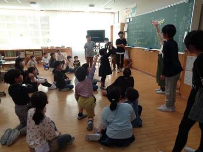 縦割り班での活動を楽しみました。ばくだんゲームやはんかちおとし、じゃんけんゲームなど、毎回6年生がみんなのことを考えながら内容を決めてくれています。1年生は、たてわりふれあいタイムを楽しみにしています。