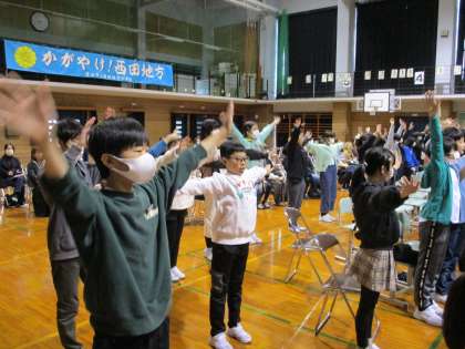 保健委員会の子供たちが姿勢について発表したり、「姿勢体操〜150周年特別バージョン〜」を披露したりしました。また、富山市体育協会のスポーツ指導委員の方によい姿勢とはどのような姿勢なのか、よい姿勢が体にとってどんなよいことあるのかを教えていただきました。