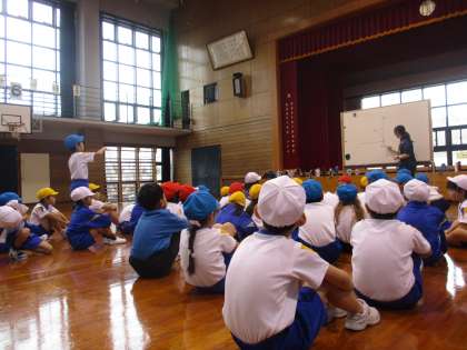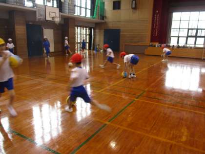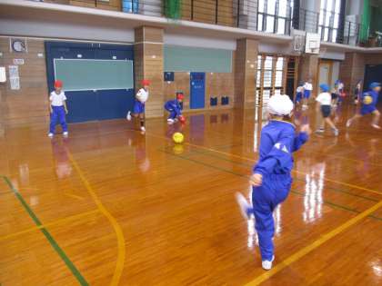 ボール蹴りゲームをしています。攻める側と守る側に分かれて得点を競い合うゲームなので、それぞれに真剣に作戦を立てながら試合に臨んでいます。
