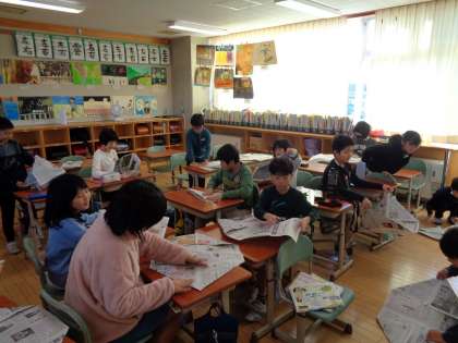 朝活動では、学習の日と係活動の日を分けて行っています。今日は、工作係が新聞紙で紙鉄砲の作り方を教えてくれました。できた紙鉄砲で早速音を鳴らしていました。