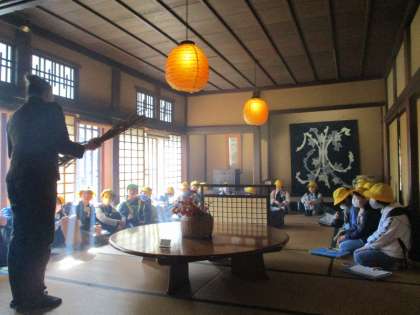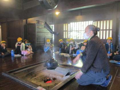 民芸合掌館では、茅葺き造りの家を見て、実際にいろりを炊いている部屋で話しを聞きました。昔の生活は、一つの炎がいろいろなことに活用されていることを知り、昔の生活が環境に優しいということも学びました。