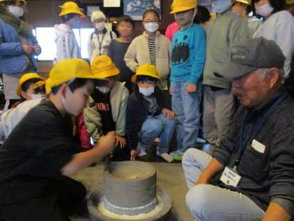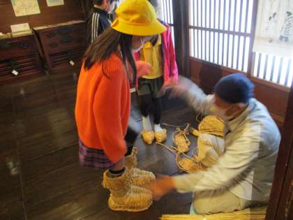 民俗資料館では、石臼体験をすることができました。「おもいな」「そば屋さんでもみたことある」など、感想をつぶやいていました。また、わらぐつやぞうりを履くこともでき、「あったかい」「歩きやすいよ」と話していました。