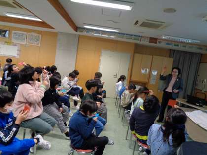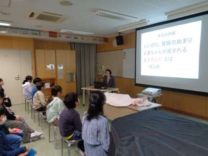 助産師の講師の先生を招いて、「命の生まれ方」についてお話をしていただきました。自分たちに命が宿ったときの小ささや、お母さんのお腹の中での成長の割合を知ると驚きの声が上がっていました。話の終わりには、今までの10年の成長を振り返り、家族や身の回りの人に支えられてきたこと、自分たちの成長が多くの人を幸せにしていることを教えていただきました。