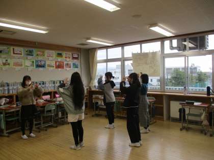 子供たちは、リズムダンスに挑戦しています。チームや曲、振り付けまで自分たちで考えて進めています。パソコンで曲を聞き比べながら気に入った曲やよく耳にする曲を選び、振りの練習にも熱が入っていました。