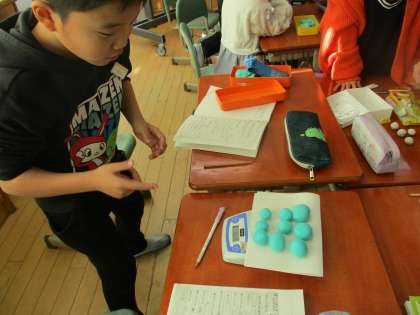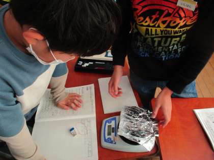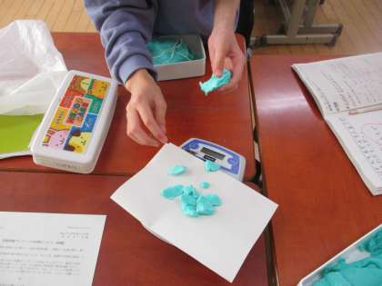 粘土やアルミニウムはくの形をかえて、重さがかわるかを調べました。形を丸くしてみたり、細かくしたりするなどし、重さに変化があるのか興味津々ではかりをのぞきこんでいました。