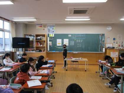 算数の時間は、分数の足し算、引き算の計算を学習しています。学級全体で課題に取り組みました。「分子だけで計算したらいいよ」「小数に直して計算してみよう」「数直線で考えたよ」など、いろいろな考え方が出てきました。