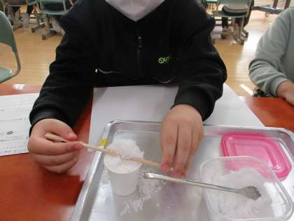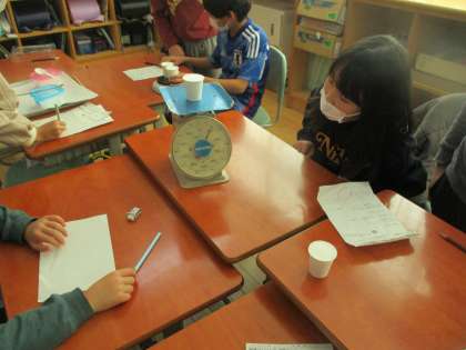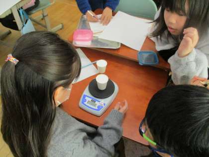 理科の実験で、同じ体積にした塩と砂糖の重さに違いはあるのか。「塩が重いよ」「少ししか差がでないんじゃないかな」「粒の大きさが関係しているのかな」など、予想を立てて、量ると、「おおおー」という反応。結果に驚いていました。