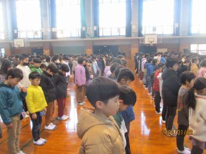 大きな地震で被災された方へ向けて、全校児童で静かに黙祷しました。子供たちの元気な姿を確認できた安心感と、3学期もみんなと勉強を頑張るぞというやる気が感じられたスタートでした。一日一日を大切にしてみんなで楽しく過ごしていきたいです。