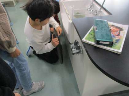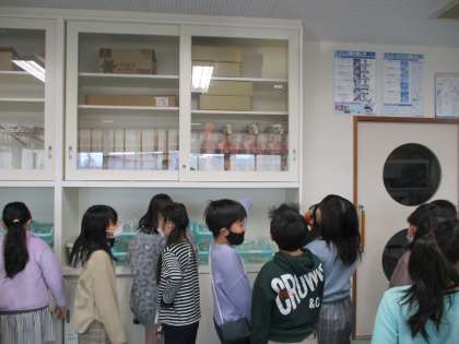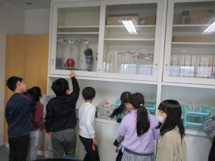 理科の学習が始まってもうすぐ1年です。理科室での実験も増えてくるので、理科室がどうなっているのか、見て回りました。「人体模型だ」「ガラスの入れ物がたくさんあるね」「水道はここにあるよ」など、いろいろな発見をした子供たちです。