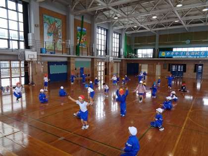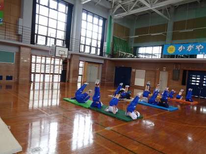 マットを使っていろいろな方向への転がり、手で支えての体の保持や回転をすることなどを楽しみ、前転や後転が美しくできるように練習しています。縄跳びは、大会が行われることもあり、子供たちは跳ぶ回数や技を増やそうと頑張っています。