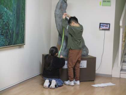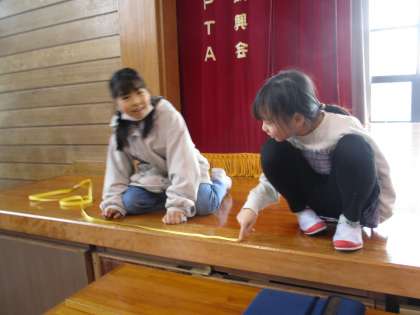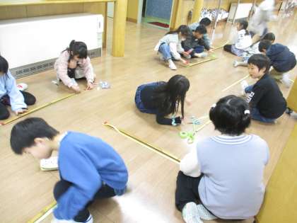 紙テープを使って、3mのものさしを作りました。ペアで、校内の測りたい部分の長さを予想し、実測しました。これまでに学習した1cmや1mの長さの感覚を基に、僅差で予想することができている子供たちも多く見られました。協力し合って目盛りを正確に読み合ったり、測りにくい場所をどうやって測ろうか相談し合って取り組んだりしていました。